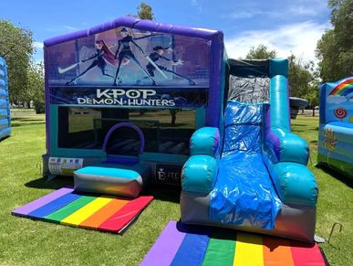 The Big Slide Banner Castle has the option to be a plain castle or change out the banner to 24 different themes to suit your event, it also has a jump room with basketball hoop and dual lane slide.